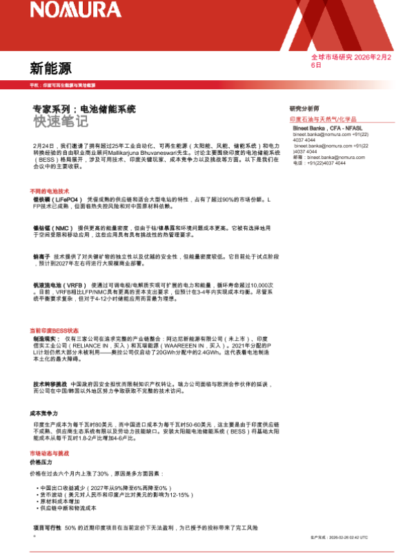 【野村金融顾问及证券私人有限公司(NFASL)】【202602】电池储能系统快速笔记-8页 行业研究