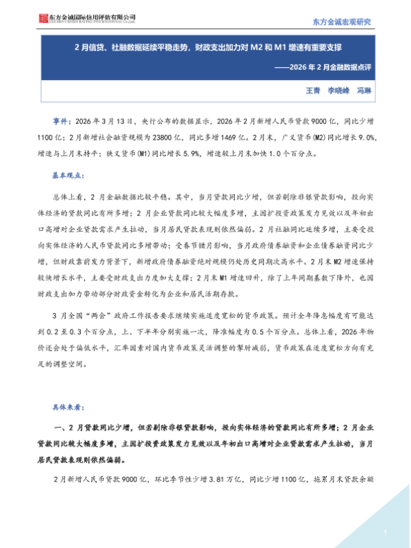 【东方金诚】【202603】2026年2月金融数据点评:2月信贷、社融数据延续平稳走势,财政支出加力对M2和M1增速有重要支撑-4页 宏观策略