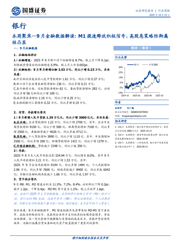 【国盛证券】【202510】银行业本周聚焦—9月金融数据解读:M1提速释放积极信号,高股息策略防御属性凸显-12页 证券期货研究报告