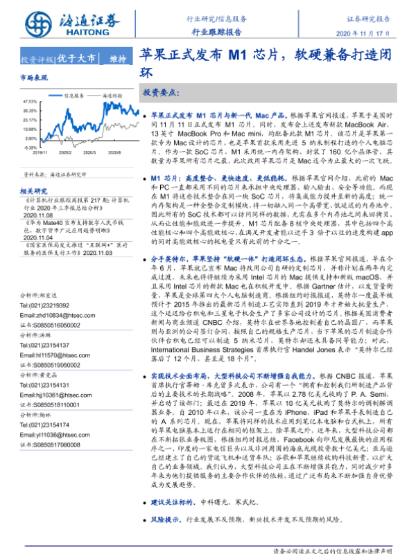 【海通证券】【20201117】信息服务行业跟踪报告:苹果正式发布M1芯片,软硬兼备打造闭环-2页 行业研究