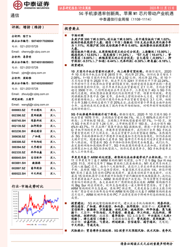 【中泰证券】【20201115】中泰通信行业周报:5G手机渗透率创新高,苹果M1芯片带动产业机遇-17页 行业研究