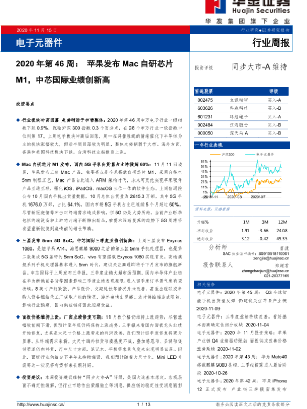 【华金证券】【20201115】电子元器件2020年第46周:苹果发布Mac自研芯片M1,中芯国际业绩创新高-13页 行业研究