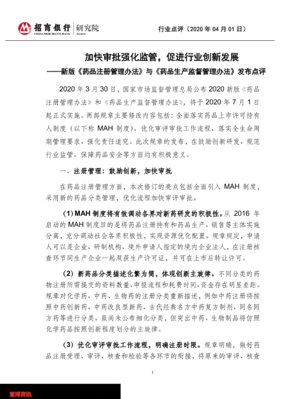【招商银行】【20200401】新版《药品注册管理办法》与《药品生产监督管理办法》发布点评-3页 行业研究