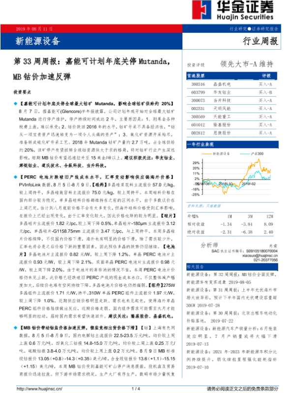 【华金证券】【20190811】新能源设备第33周周报:嘉能可计划年底关停Mutanda,MB钴价加速反弹-4页 行业研究