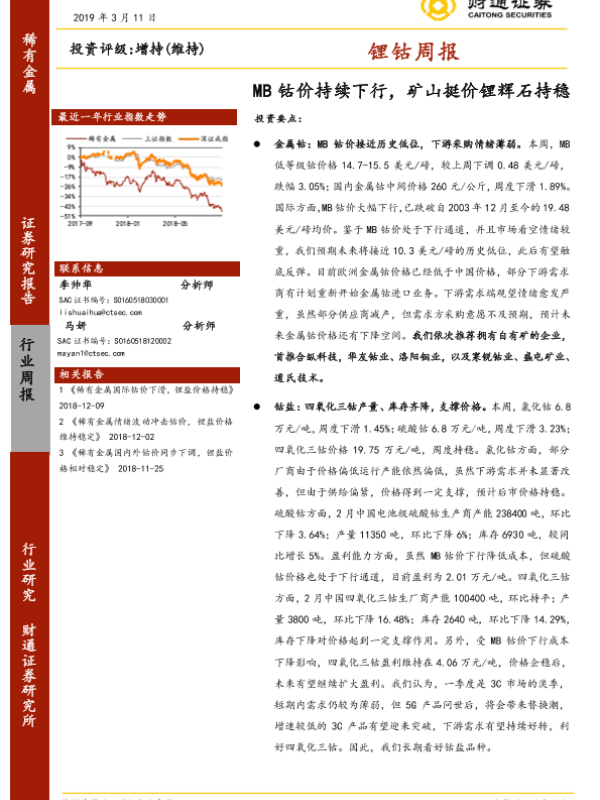 【财通证券】【20190311】20190311-财通证券-锂钴周报:MB钴价持续下行,矿山挺价锂辉石持稳-12页 行业研究