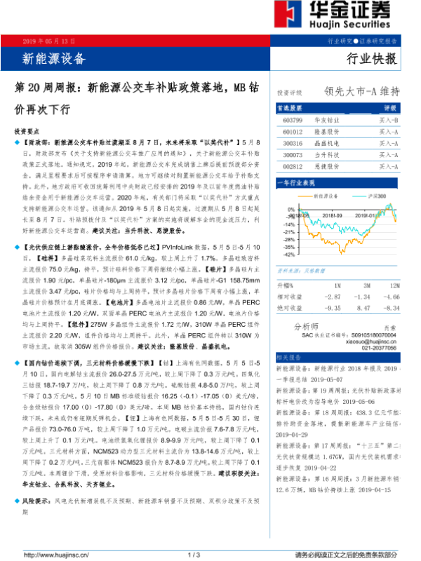 【华金证券】【20190513】20190513-华金证券-新能源设备第20周周报:新能源公交车补贴政策落地,MB钴价再次下行-3页 行业研究