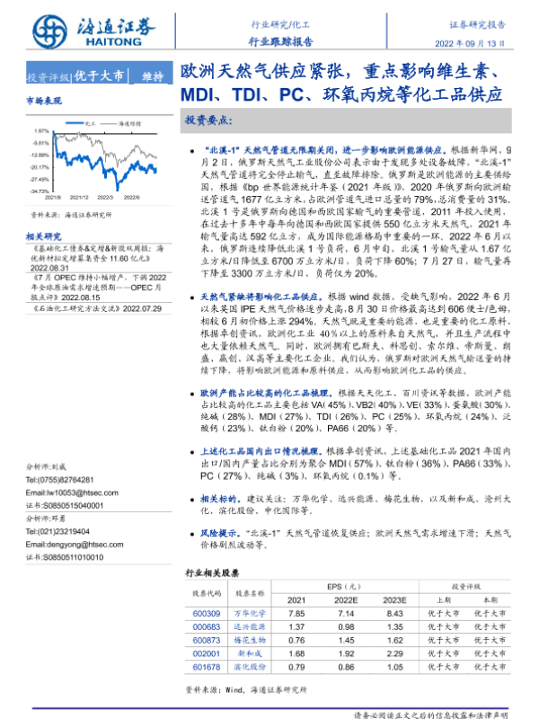 【海通证券】【20220913】欧洲天然气供应紧张,重点影响维生素、MDI、TDI、PC、环氧丙烷等化工品供应-2页 行业研究