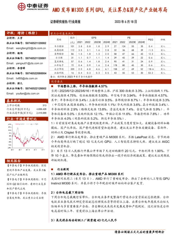 【中泰证券】【20230618】20230618-中泰证券-电子行业周报:AMD发布MI300系列GPU,关注算力&国产化产业链布局-13页 行业研究