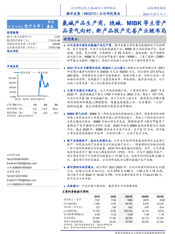 【海通证券】【20220311】镇洋发展:氯碱产品生产商,烧碱、MIBK等主营产品景气向好,新产品投产完善产业链布局-20页 行业研究