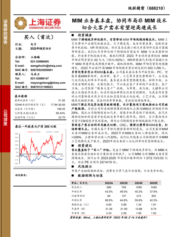 【上海证券】【20230816】统联精密(688210)MIM业务基本盘,协同布局非MIM技术切合大客户需求有望迎高速成长-20页 行业研究