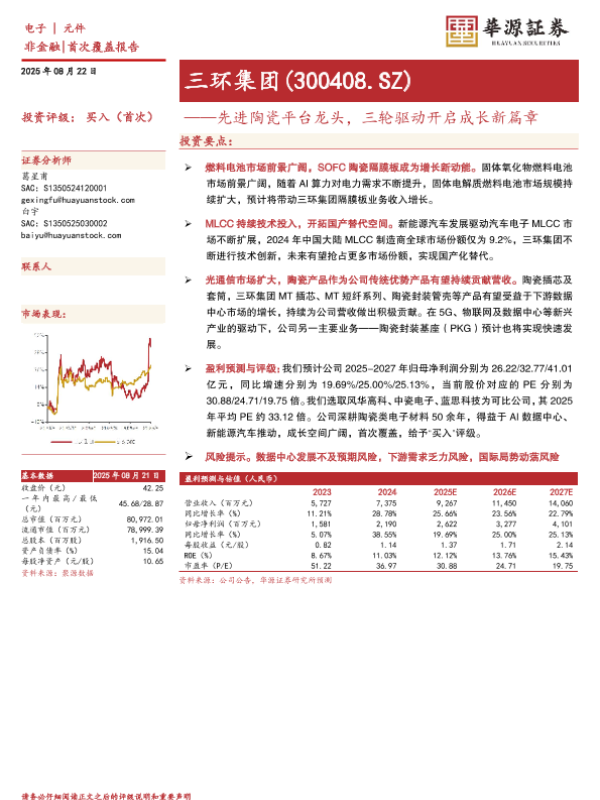 【华源证券】【202508】三环集团(300408)先进陶瓷平台龙头,三轮驱动开启成长新篇章-15页 证券期货研究报告