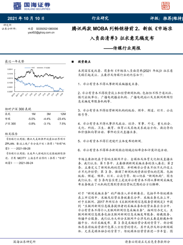 【国海证券】【20211010】20211010-国海证券-传媒行业周报:腾讯两款MOBA列畅销榜前2,新版《市场准入负面清单》征求意见稿发布-33页 行业研究