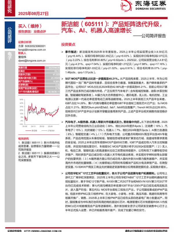 【东海证券】【20250827】新洁能-产品矩阵迭代升级,汽车、AI、机器人高速增长-4页 证券期货研究报告