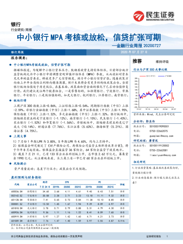 【民生证券】【20200727】金融行业周报:中小银行MPA考核或放松,信贷扩张可期-18页 行业研究