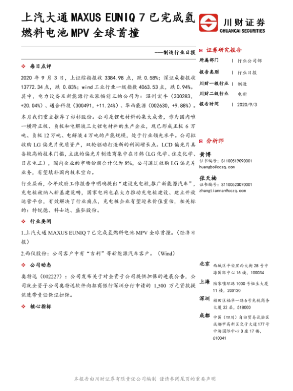 【川财证券】【20200903】制造行业日报:上汽大通MAXUS EUNIQ 7已完成氢燃料电池MPV全球首撞-3页 行业研究