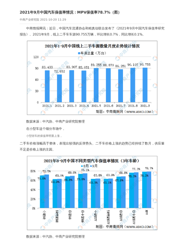 【中商产业研究院】【20211020】2021年9月中国汽车保值率情况-2页 市场调研