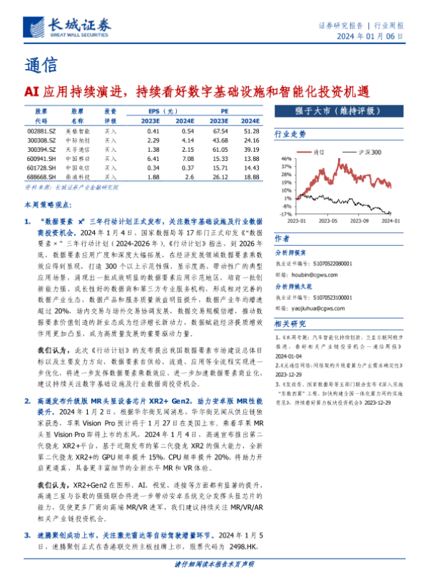 【长城证券】【20240106】20240106-长城证券-通信行业周报:AI应用持续演进,持续看好数字基础设施和智能化投资机遇-19页 行业研究