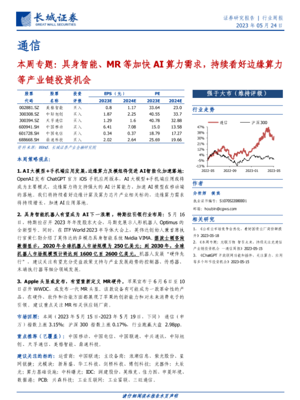 【长城证券】【20230524】通信本周专题:具身智能、MR等加快AI算力需求,持续看好边缘算力等产业链投资机会-16页 行业研究