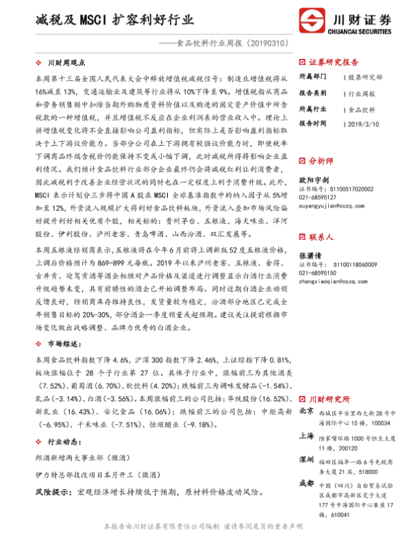 【川财证券】【20190310】20190310-川财证券-食品饮料行业周报:减税及MSCI扩容利好行业-14页 行业研究