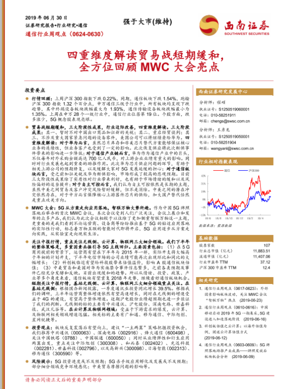 【西南证券】【20190630】20190630-西南证券-通信行业周观点:四重维度解读贸易战短期缓和,全方位回顾MWC大会亮点-40页 行业研究