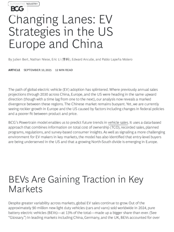 【Julien Bert&Nathan Niese&Eric Li (李科)&Edward Anculle&Pablo Lapeña Molero】【20250910】Changing Lanes EV Strategies in the US Europe and China-8页 行业研究
