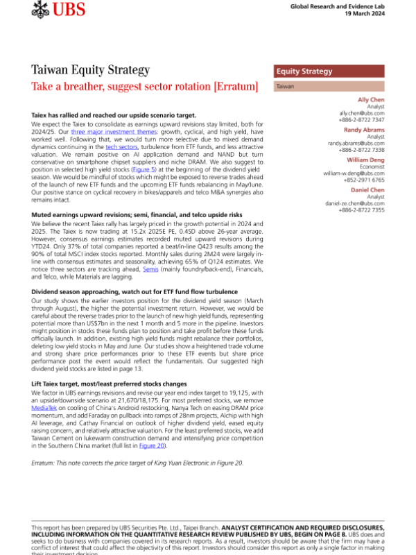 【UBS Securities Pte. Ltd.&Taipei Branch】【20240319】Taiwan Equity Strategy _Take a breather, suggest sector rotation-13页 行业研究