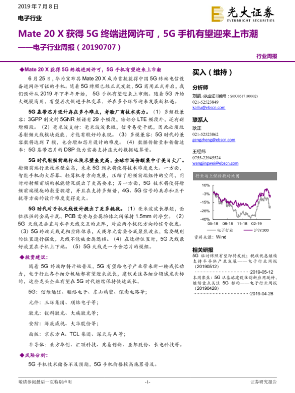 【光大证券】【20190708】20190708-光大证券-电子行业周报:Mate 20X获得5G终端进网许可,5G手机有望迎来上市潮-9页 行业研究