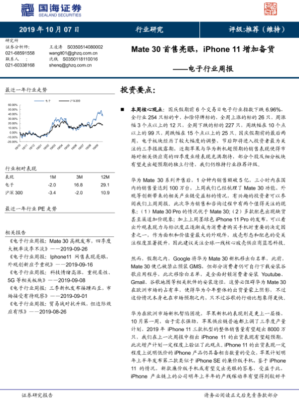【国海证券】【20191007】电子行业周报:Mate 30首售亮眼,iPhone 11增加备货-13页 行业研究