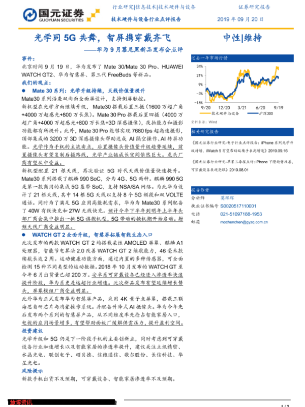 【国元证券】【20190920】技术硬件与设备行业点评报告:华为9月慕尼黑新品发布会点评-光学同5G共舞,智屏携穿戴齐飞-2页 行业研究
