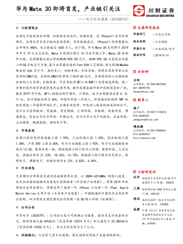 【川财证券】【20190916】20190915-川财证券-电子行业周报:华为Mate 30即将首发,产业链引关注-10页 行业研究
