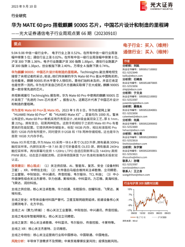 【光大证券】【20230910】20230910-光大证券-通信电子行业周观点第66期:华为MATE 60 pro搭载麒麟9000S芯片,中国芯片设计和制造的里程碑-11页 行业研究