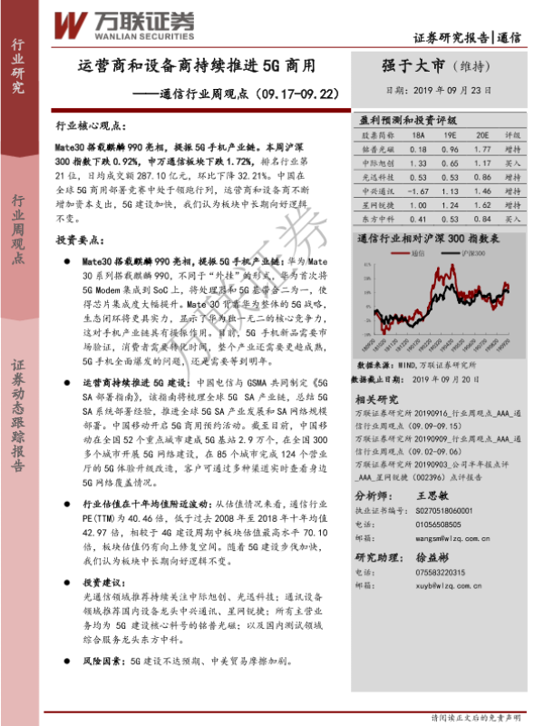 【万联证券】【20190923】20190923-万联证券-通信行业周观点:运营商和设备商持续推进5G商用-10页 行业研究