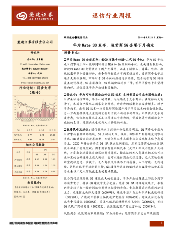【爱建证券】【20190923】通信行业周报:华为Mate30发布,运营商5G套餐下月确定-12页 行业研究