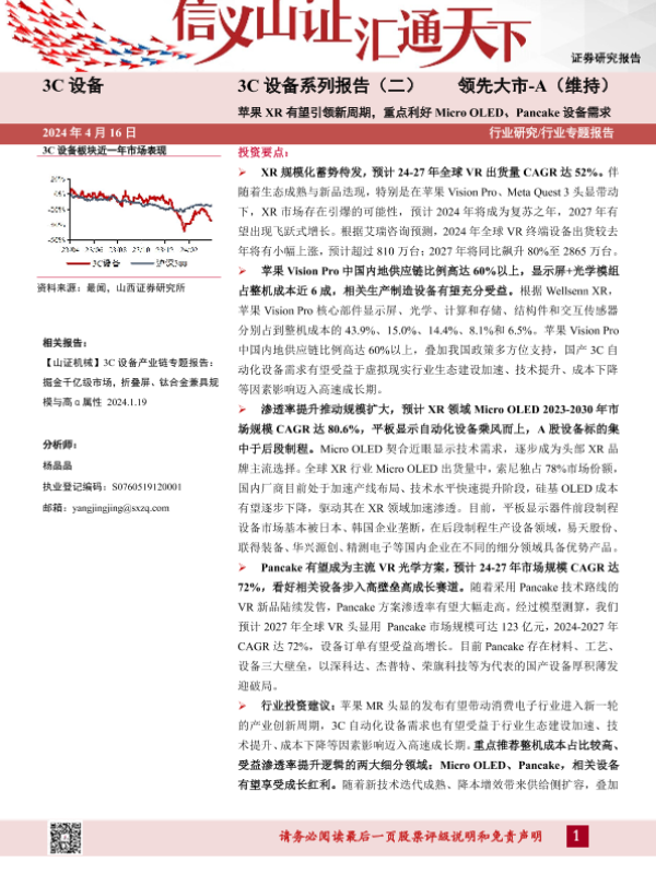 【山西证券】【20240416】3C设备行业系列报告(二):苹果XR有望引领新周期,重点利好Micro+OLED、Pancake设备需求-34页 行业研究