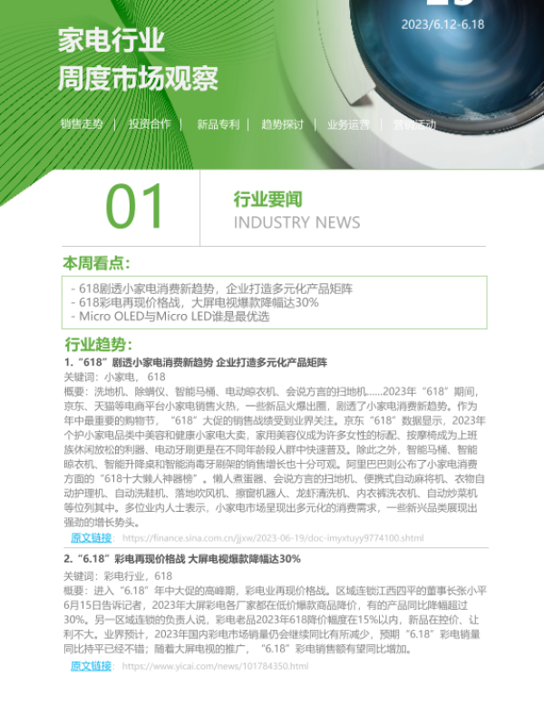 【艾瑞咨询】【20230618】2023年第25周:家电行业周度市场观察-6页 市场调研