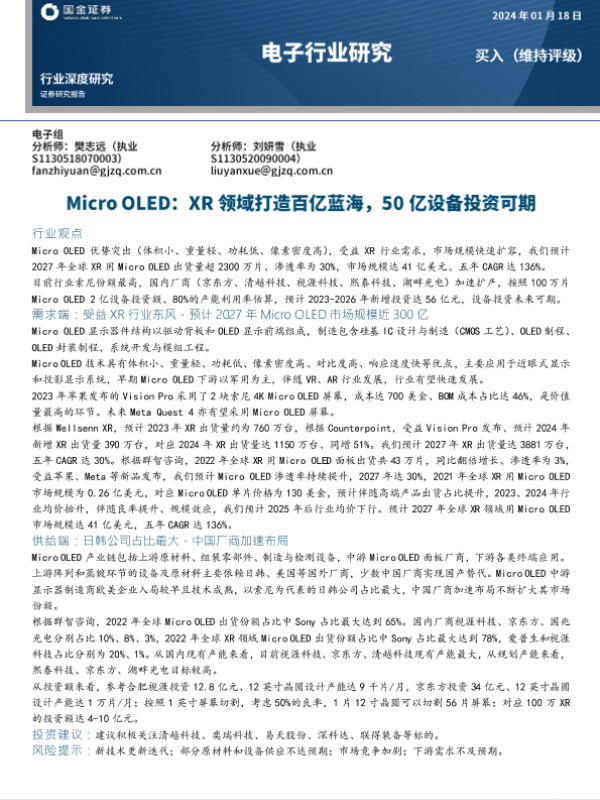 【国金证券】【20240118】电子行业研究:Micro OLED:XR领域打造百亿蓝海,50亿设备投资可期-28页 行业研究