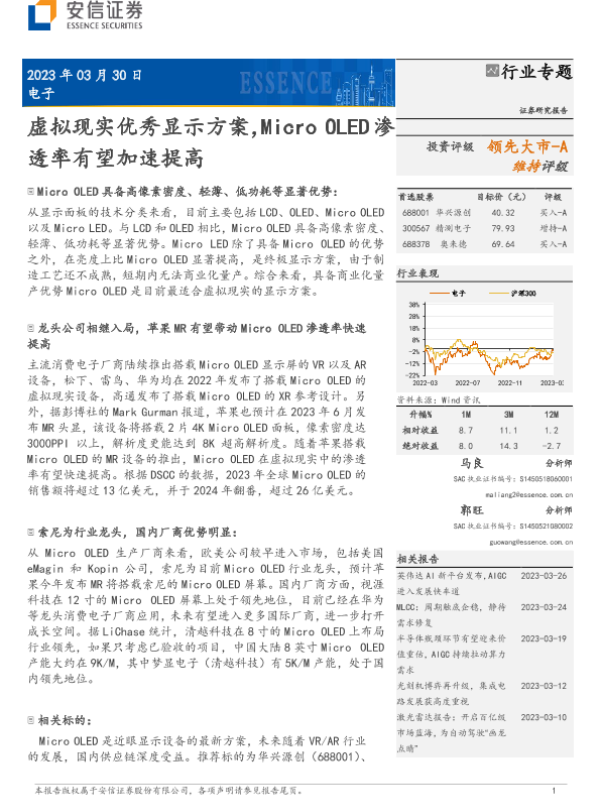 【安信证券】【20230331】2023年03月31日更新-电子行业专题-虚拟现实优秀显示方案-Micro OLED渗透率有望加速提高-28页 行业研究