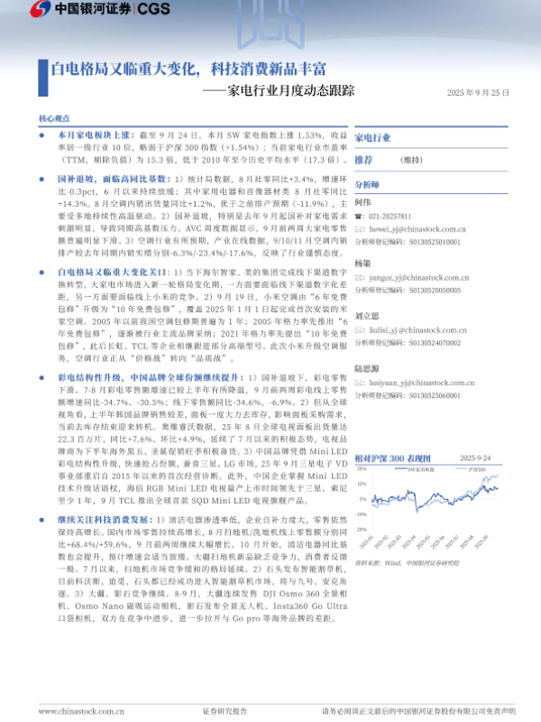 【银河证券】【202509】家电行业月度动态跟踪:白电格局又临重大变化,科技消费新品丰富-36页 证券期货研究报告