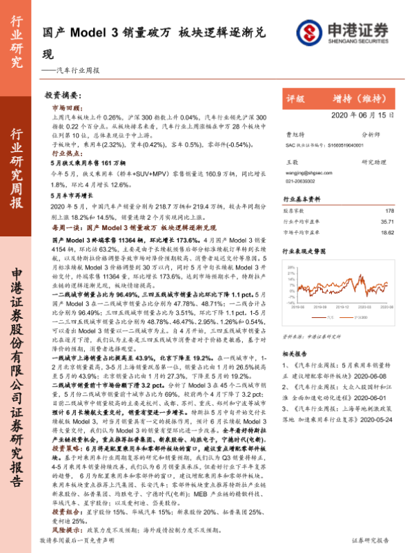 【申港证券】【20200615】20200615-申港证券-汽车行业周报:国产Model 3销量破万 板块逻辑逐渐兑现-29页 行业研究
