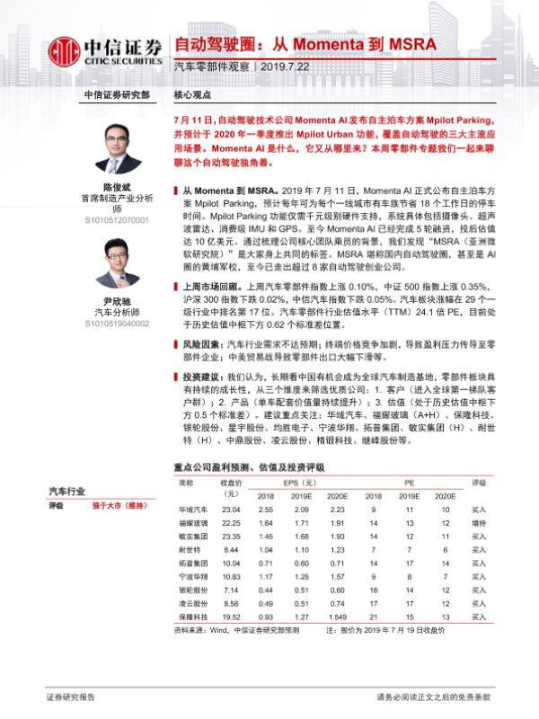 【中信证券】【20190722】汽车零部件观察:自动驾驶圈:从Momenta到MSRA-13页 行业研究