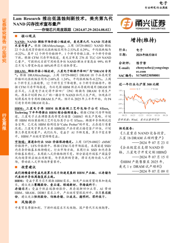 【甬兴证券】【20240808】电子行业存储芯片周度跟踪:Lam Research推出低温蚀刻新技术,美光第九代NAND闪存技术宣布量产-11页 行业研究