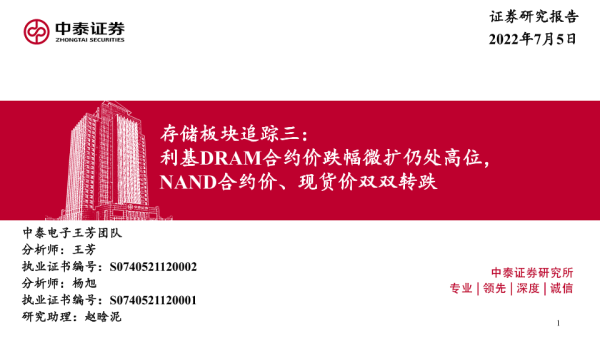 【中泰证券】【20220705】存储板块追踪三:利基DRAM合约价跌幅微扩仍处高位,NAND合约价、现货价双双转跌-46页 行业研究