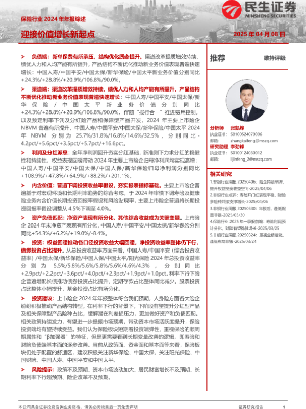 【民生证券】【20250408】保险行业2024年年报综述:迎接价值增长新起点-34页 行业研究