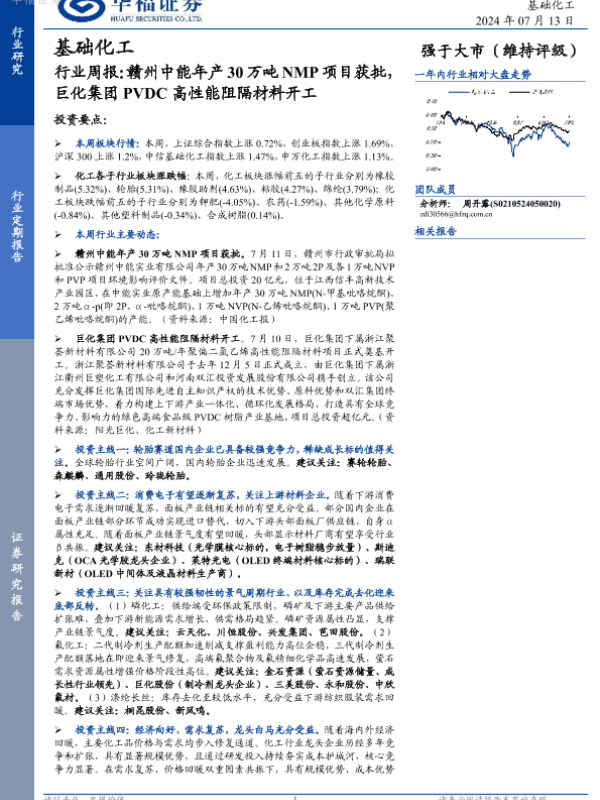【华福证券】【20240713】基础化工行业周报:赣州中能年产30万吨NMP项目获批,巨化集团PVDC高性能阻隔材料开工-23页 行业研究