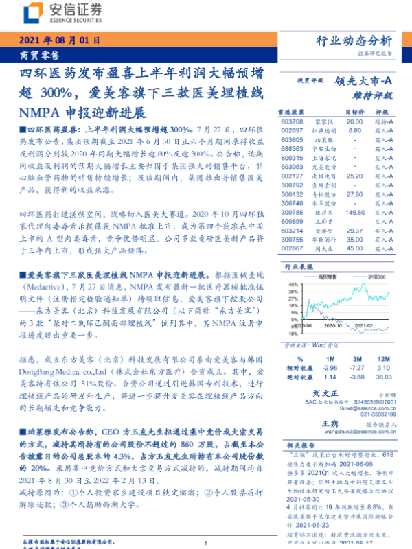 【安信证券】【20210801】商贸零售行业动态分析:四环医药发布盈喜上半年利润大幅预增超300%,爱美客旗下三款医美埋植线NMPA申报迎新进展-16页 行业研究