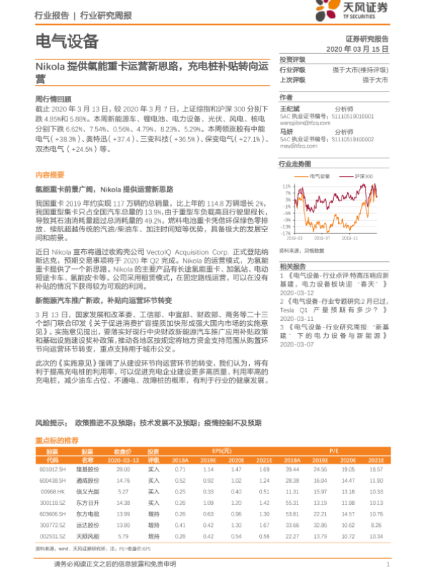 【天风证券】【20200315】电气设备行业研究周报:Nikola提供氢能重卡运营新思路,充电桩补贴转向运营-14页 行业研究