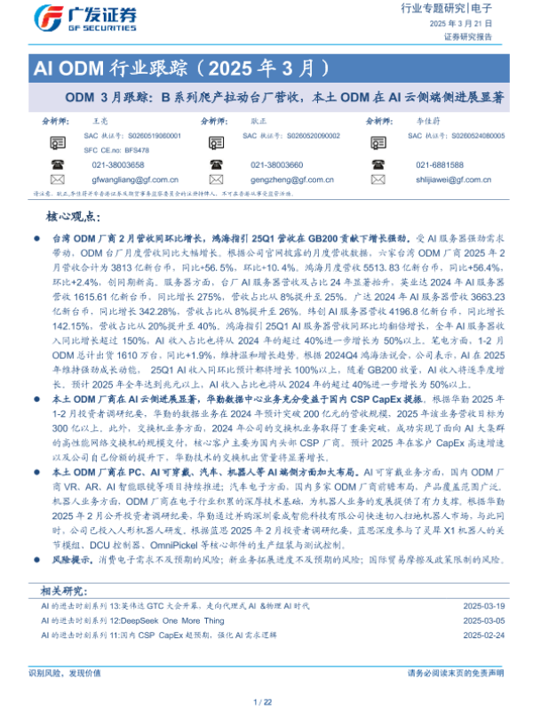 【广发证券】【20250321】AI ODM行业跟踪(2025年3月):ODM 3月跟踪:B系列爬产拉动台厂营收,本土ODM在AI云侧端侧进展显著-22页 行业研究