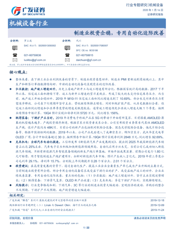 【广发证券】【20200116】机械设备行业专题研究:制造业投资企稳,专用自动化边际改善-22页 行业研究