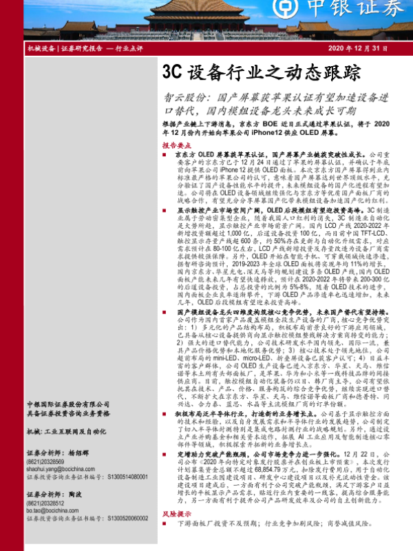 【中银证券】【20201231】3C设备行业之动态跟踪:智云股份:国产屏幕获苹果认证有望加速设备进口替代,国内模组设备龙头未来成长可期-3页 行业研究
