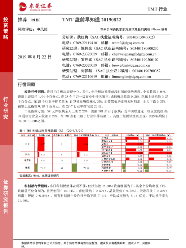 【东莞证券】【20190822】TMT盘前早知道:苹果公司委托京东方测试最新的尖端iPhone屏幕-5页 行业研究